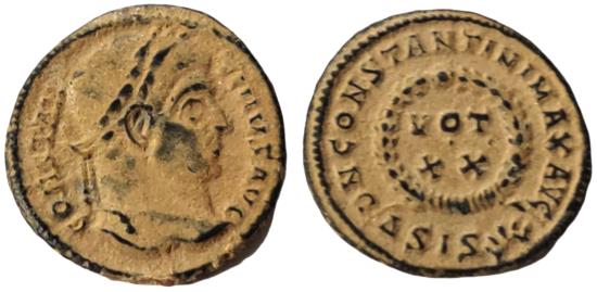 CONSTANTINVS AVG, laureate head right / D N CONSTANTINI MAX AVG VOT XX in two lines within wreath; DSIS (sunburst).