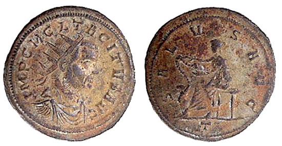 Obv: IMP CM CL TACITUS AVG. Rev: SALUS AVG Salus seated feeding serpent arising from altar, in ex T, Ticinium Mint. RIC 56. EF