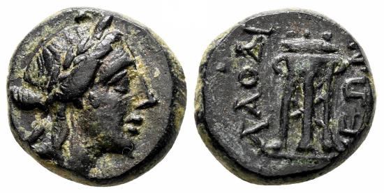 Obverse: Head of Aphrodite right, wearing sphendone. Reverse: ΛAOΔI-KEΩN to left and right of tripod. EF condition, conserving full details on both sides and very bold reliefs checkable at photo. Green patina. Scarce issue: only ONE coin auctioned in the last 20 years. BMC 44. Laodicea ad Lycum, ca. 2nd Century BC. 3,35 g - 12 mm -------------------------------------------------------------------------------------------------- Visit our site about Numismatics and Archaeology: aeternitas-numismatics.com |