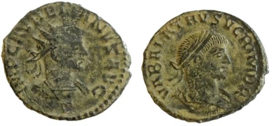 Aurelian, with Vabalathus. AD 270-275. Antoninianus. 21 mm - 3.9 g. Antioch mint, officina A. November AD 270-March AD 272. Radiate and cuirassed bust of Aurelian right;/ Laureate, draped, and cuirassed bust of Vaballathus right.