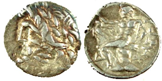 TRIOBOL 330-275 BC. Obv: Head of Zeus left. Rev: Pan seated left on rock, raising a hand, holding logobolon, eagle in field MEr to right, delta in front of left knee, x behind chair BMC1-2 SNG Cop 255 , AU with golden highlights
