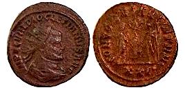 | TCRIS-238-B, DIOCLETIAN AE 22.6 mm 3.68 gm, ANTONINIANUS, 293-295 AD, ANTIOCH MINT, Obv: IMP CC VAL DIOCLETIAN PP AVG, Rev: CONCORDIA MILITVM receiving victory in the globe from Jupiter. R/XXI, RIC-322 from Glendennings 97, gVF, NICE CHOCOLATE COLOR. |