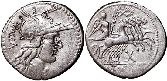 TCRRS-3464, Roman Republic. M TULLIUS, AR 3.81 gm, Obv: Helmeted Head of Roma, ROMA behind. Rev: Victory in quadriga holding palm branch, wreath above. VF