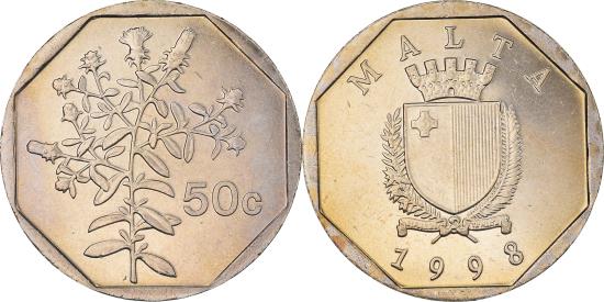 | | Coin, Malta, 50 Cents, 1998, , Copper-nickel, KM:98 | | | Crowned shield within sprigs, Tulliera plant and value, Galea Bason | | FEATURES |