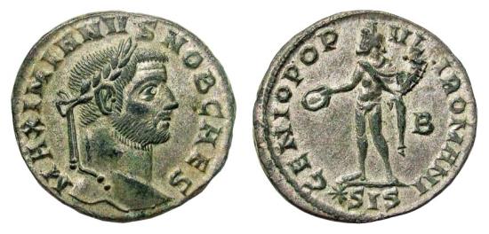 | Reign | Gaius Galerius Valerius Maximianus 305-311 AD. | | Denomination | AE Follis | | Date Struck | 296 AD. | | Mint | Siscia, 2nd officina | | Obverse | MAXIMIANVS NOB CAES, laureate head right | | Reverse | GENIO POPVLI ROMANI, Genius, naked but for cloak, standing left, holding patera in his right hand and cornucopiae with his left, B in right field, *SIS in ex | | Weight | 8.48 grams | | Diameter | 27/26 mm | | Reference | RIC VI 98b | | Grade | Extremely fine, green patina with silvering | | Comments | An attractive example with an elegant portrait and almost intact silvering. | |
