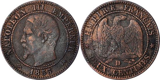| Coin, France, Napoleon III, 2 Centimes, 1855, Lyon, ancre grand lion, |