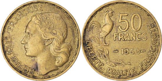 | | Coin, France, Guiraud, 50 Francs, 1952, Paris, , Aluminum-Bronze | | | Guiraud, Head left, Denomination above date at right, rooster above laurel branch at left, Without mint mark. | | FEATURES |