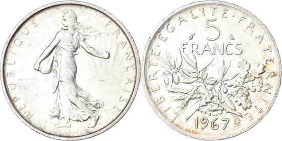 | | Coin, France, Semeuse, 5 Francs, 1967, , Silver, KM:926, Gadoury:770 | | | Semeuse, Figure sowing seed, Branches divide denomination and date | | FEATURES |