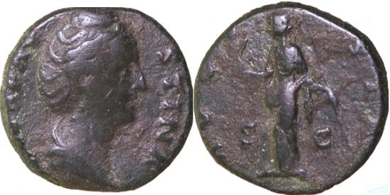 TCRIB-249, FAUSTINA, AE 9.69 gm 24 mm DUPONDUS, C-141 AD. Obv: DIVA FAUSTINA, BUST RIGHT. Rev: AVGUSTA SC, Ceres standing left holding corn ears in the left hand and a short torch in right hand. C-89, RIC-1171. gF