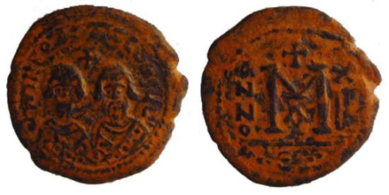 | TCBYZB-24, ALEXANDRETTA. REVOLT OF HERCULII, AE 9.37 gm 28 mm FOLLIS, 608-610 AD. ERA (CLIO)CONSULII Bareheaded and bearded facing busts of Heracllus (on left)and his father, the Exarch Heraclius, wearing consular robes; above between them, cross. Large M between A/N/N/O and X/II(I); above, cross; below, A: beneath exergual line. x BERK/ENGLAND 89 and Nobles 07 to me. Very Rare! The nicest full portrait good flan coin that I could find. aEF |