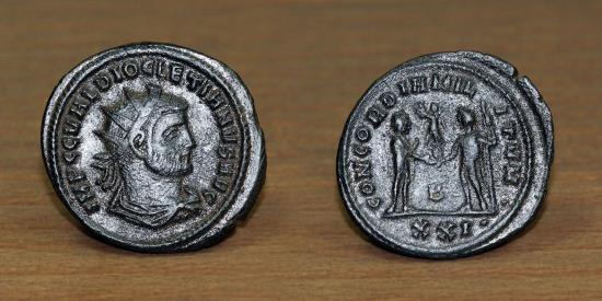 Roman Empire AE, Diocletian (284–305AD), Antoninianus Heraclea, Marmara Ereglisi mint, (291AD) OBV: "IMP C C VAL DIOCLETIANVS AVG"; radiate, draped & cuirassed bust of Diocletian right. REV: "CONCORDIA MILITVM • B • XXI •"; Jupiter standing right with scepter, presenting Victory on globe to emperor, standing left. Weight: 4.25gm Size: 24mm Extremely Fine.