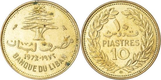 | | Coin, Lebanon, 10 Piastres, 1972, Paris, , Nickel-brass, KM:26 | | | Cedar tree above dates, Value within wreath | | FEATURES |