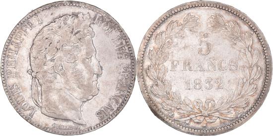 | | Coin, France, Louis-Philippe, 5 Francs, 1832, Paris, , Silver | | | Louis-Philippe, Laureate head right, Mint marks at edge outside wreath, LOUIS PHILIPPE I ROI DES FRANCAIS | | FEATURES |