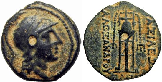 SELEUKID KINGS of SYRIA. Alexander I Balas. 152-145 BC. Æ (14mm, 2.57 g, 12h). Antioch mint. Struck 150-146 BC. Head of Athena right, wearing Corinthian helmet / Tripod; star in exergue. SC 1796.3; HGC 921. VF, dark green patina, earthen deposits.