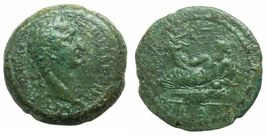 EGYPT.ALEXANDRIA.Trajan AD 98-117.AE.Drachma.struck AD 98. ( 22.00g, 35.3mm, 12h ) AVT KAIC NEP - TPAIAN CEB ΓΕΡΜ, laurate bust right of Trajan. Reverse.Nilus right reclining on crocodile holding in right hand cornucopiae from which emerges Genii inscribing cubits LS ( 16 ), reed in left hand, in exergue regnal year LA ( first year of reign AD 98 ). Ref:RPC III.4210, BMC pg.57.No.465 ( Plate XIX), Milne.-, SNG Cop.1013, Emmett 550. soft strike, better than very fine, attractive glossy jade green patina. The figure 16 in the field reflects the number of cubics the river Nile required to raise to ensure a good harvest. |