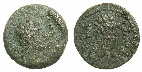 EGYPT.ALEXANDRIA.Augustus 30 BC - AD 14.AE.Obol.4th Series. ( 17.49g, 29.5mm, 12h ) ( ΠΑΤΗΡ ΠΑΤΡΙΔΟΣ ) , bare headed bust right of Augustus. Reverse.ΣΕΒΑΣΤΟΣ, single cornucopia with fruit. Ref:RPC I. 5029 ( 4 examples recorded ), BMC 26, SNG Cop.-, Milne 18-19.-.Frankfurt.9, Koln.13. Emmett.25 Good fine / very fine, rough surfaces, obverse trace of an undertype. |