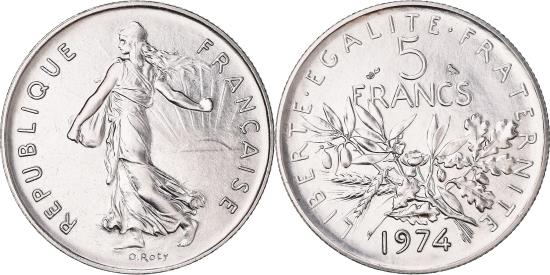 | | Coin, France, Semeuse, 5 Francs, 1974, Paris, FDC, , Nickel Clad | | | Semeuse, The Seed Sower, Branches divide denomination and date, From a FDC box. | | FEATURES |