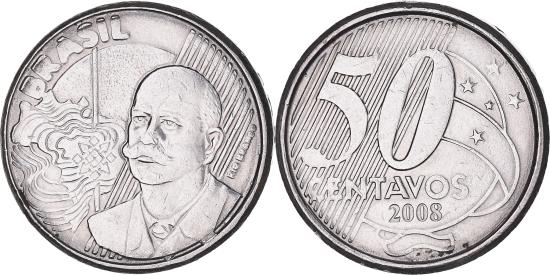 | | Coin, Brazil, 50 Centavos, 2008, , Stainless Steel, KM:651a | | | Rio Branco bust at right, map at left, Denomination on linear design at left, 3/4 globe with sash on right, date below | | FEATURES |