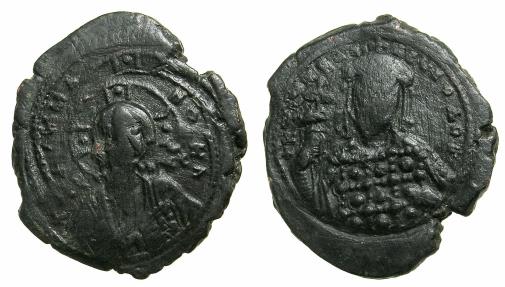 BYZANTINE EMPIRE.Constintine X Ducas AD 1050-1067.AE.Follis.Mint of CONSTANTINOPLE. ( 9.38g, 28.8mm, 6h ) (EM)MANO(V)HΛ, Facing bust of Christ, nimbate, wearing pallium and colobium, right hand raised in benediction, book of gospel held in left. Reverse.+ΚWΝ ΡΑCΙΛΕVC O ΔOV, Facing bust of Constantine X wearing loros, holding long cross in right hand and akaia in left. Ref:Sear 1854. Good very fine for issue, faces flat, obverse die shift. Very difficult to find with full legends. End of reverse legend ends ΔOV instead of ΔOVK ( K omitted ). |