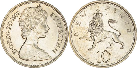 | | Coin, Great Britain, Elizabeth II, 10 New Pence, 1979, , Copper-nickel | | | Young bust right, Crowned lion prancing left, Arnold Machin | | FEATURES |