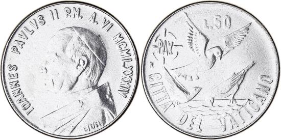 | | Coin, VATICAN CITY, John Paul II, 50 Lire, 1984, Roma, , Stainless | | | Bust left, Doves | | FEATURES |