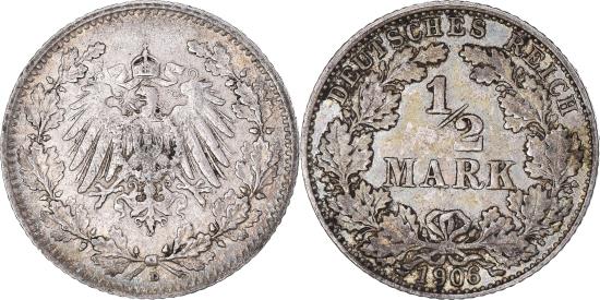 | | Coin, GERMANY - EMPIRE, 1/2 Mark, 1906, Munich, , Silver, KM:17 | | | Denomination within wreath, Crowned imperial eagle with shield on breast within wreath, Some coins dated from 1918-19 were issued with a black finish to prevent hoarding. | | FEATURES |