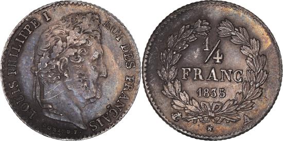 | | Coin, France, Louis-Philippe, 1/4 Franc, 1835, Paris, , Silver | | | Louis-Philippe, Laureate head right, Denomination within wreath, LOUIS PHILIPPE I ROI DES FRANCAIS | | FEATURES |