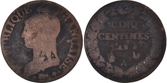 | | Coin, France, Dupré, 5 Centimes, AN 8, Paris, , Bronze, KM:640.1 | | | Dupré, Liberty head left, Value within oak wreath, REPUBLIQUE FRANCAISE <Bullet> * | | FEATURES |