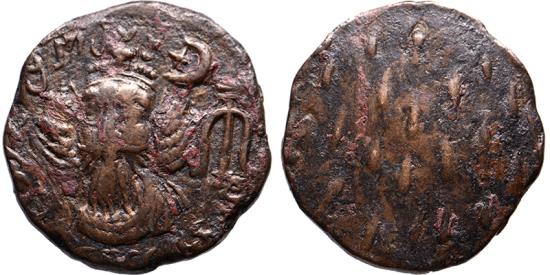 Obverse: diademed and draped bust facing slightly to left, wearing tiara; above, star within crescent above inverted anchor with two crossbars Reverse: regular series of dashes Ex. Roma Numismatics Ltd E-Sale 88, lot 561