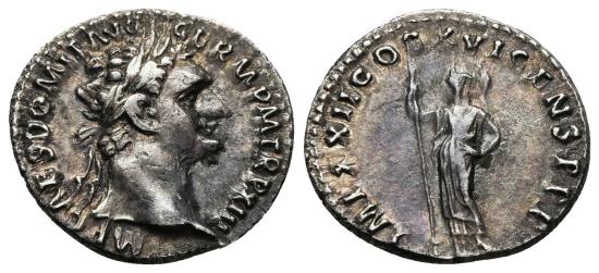 DOMITIAN. Ar, Denarius. AD 93-94. Rome mint. Ovb/ IMP CAES DOMIT AVG GERM P M TR P XIII, laureate head to right. Rev/ IMP XXII COS XVI CENS P P P, Minerva standing to left, holding thunderbolt and spear; shield at feet. Cat: RIC II.1 763; BMCRE 219; RSC 283. Silver (AR) 3,1g - 18mm. Beautiful tone. |