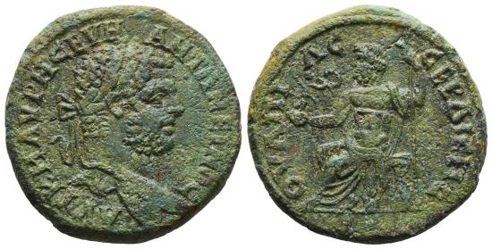 CARACALLA. Ae 30 of Serdica, Thrace. AD 198-217. Ovb/ AYT K M AYPH CEYH ANTΩNEINOC, radiate head to right. Rev/ OYΛΠIAC CEPΔIKHC, Zeus seated to left, holding patera and long sceptre. Cat: H&J, Serdica 12.18.1.3 var; Ruzicka -; Varbanov 2500 var. Bronze (Ae) 16,9g - 30mm. Very rare, variant with winged victory and laureate bust. |