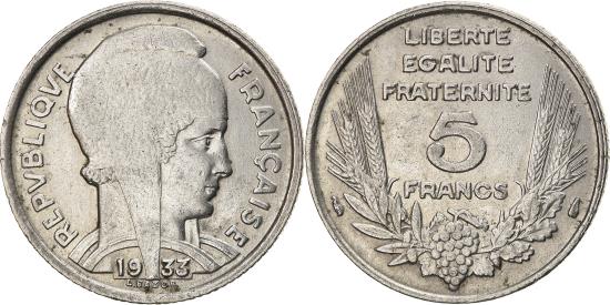 | | Coin, France, Bazor, 5 Francs, 1933, Paris, , Nickel, KM:887 | | | Bazor, Head right, date below, Denomination flanked by grain sprigs, Without mint mark. | | FEATURES |