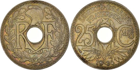 | | Coin, France, Lindauer, 25 Centimes, 1936, , Copper-nickel, KM:867a | | | Lindauer, Monogram divided by center hole, liberty cap above, wreath surrounds, Without dash under MES in denomination, Varieties: Edges reeded on 1920, 1929, 1931, different hole. | | FEATURES |