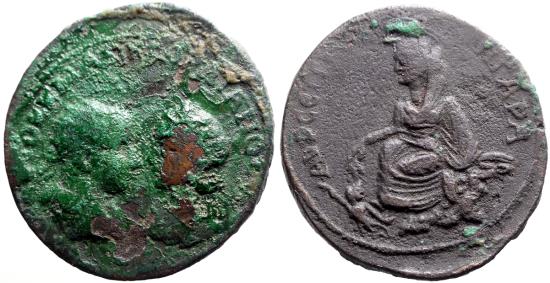 Gordian III & Tranquillina AE31 Singara, Mesopotamia. Tyche Obv: Confronted busts of Gordian on l., laureate, draped and cuirassed, and Tranquillina on r., draped and wearing stephane. Rev: Tyche seated l. on rock, holding branch; the centaur Sagittarius above to l., discharging arrow, river god swimming l. below. SNG Cop. 256. AD 238-244. 23.16g. Patina vastly different per side. |