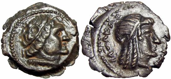 PTOLEMAIC KINGS of EGYPT. Ptolemy V Epiphanes. 204-180 BC. Æ (14mm, 1.82 g, 11h). Kyrene mint. Diademed bust of Ptolemy I right, wearing aegis / Diademed bust of Libya right. Asolati 75; Svoronos 874. Good VF, dark brown patina, choice for the type.