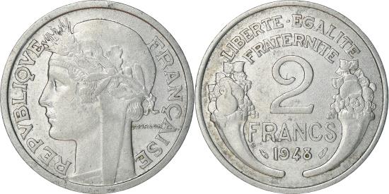 | | Coin, France, Morlon, 2 Francs, 1948, Paris, , Aluminum, KM:886a.1 | | | Morlon, Laureate head left, Denomination and date flanked by cornucopias | | FEATURES |