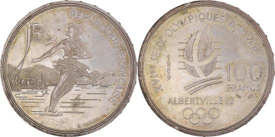 | | Coin, France, Ice Skating Couple, 100 Francs, 1989, Albertville 92, | | | Ice Skating Couple, Cross on flame, date and denomination, logo below, without capsule, without certificate | | FEATURES |