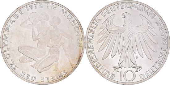 | | Coin, GERMANY - FEDERAL REPUBLIC, 10 Mark, 1972, Stuttgart, , Silver | | | Eagle above denomination, Athletes kneeling, Munich Olympics, Issued 1971. | | FEATURES |