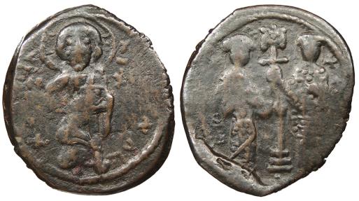 AE Follis 10.60g. 30mm. Constantinople Mint Christ standing facing on footstool, wearing nimbus cr. Pallium and colobium, and holding gospels; IC in l. field; XC in r. field. +EMMANOVHA Eudocia and Constantine X standing facing, holding labarum with cross on shaft between them. +KWN T DK EVDK AVGO Sear 1853 Dark brown patina. Typical areas of irregularity.