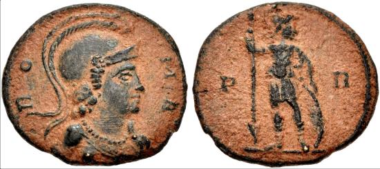 AD 330-354. Æ Follis (15mm, 1.56 g, 12h). Rome mint. Struck under Constantius II, circa AD 348. Helmeted and draped bust of Roma right / Emperor standing right, wearing military attire, holding spear and shield set on ground to right; P R across field. RIC VIII 104; LRBC 611; Vagi 3049. Black desert patina. VF. Rare.