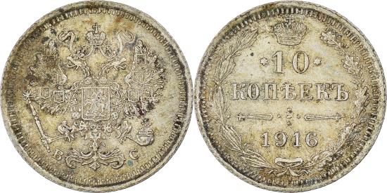 | | Coin, Russia, Nicholas II, 10 Kopeks, 1916, Saint-Petersburg, , Silver | | | Crowned double-headed imperial eagle, ribbons on crown, Crown above value and date within wreath, Struck at Petrograd without mintmaster initials. | | FEATURES |