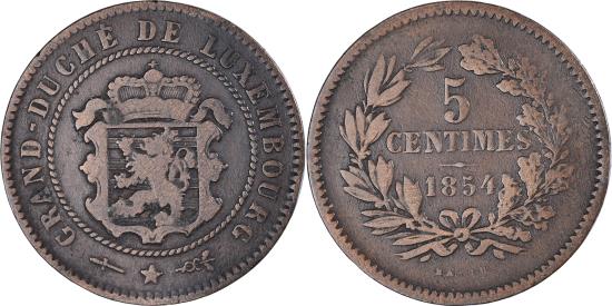 | | Coin, Luxembourg, William III, 5 Centimes, 1854, Utrecht, , Bronze | | | Crowned ornate shield within rope wreath, Value and date within wreath, GRAND-DUCHE DE LUXEMBOURG | | FEATURES |