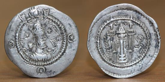Sassanian Kings AR Drachm, Kavadh I, second reign (499-531 AD), Mint: Marw (MR), Date: 37 Obv: King Bust to right wearing mural crown with frontal crescent and korymbos. Rev: Fire altar with ribbons flanked by two attendants, star and crescent flanking flames. Weight: 3.96gm Size: 30mm Tone, Near EF, Good Very Fine.