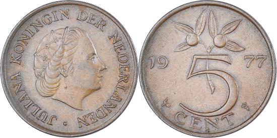 | | Coin, Netherlands, Juliana, 5 Cents, 1977, , Bronze, KM:181 | | | Head right, Value divides date and orange branch | | FEATURES |