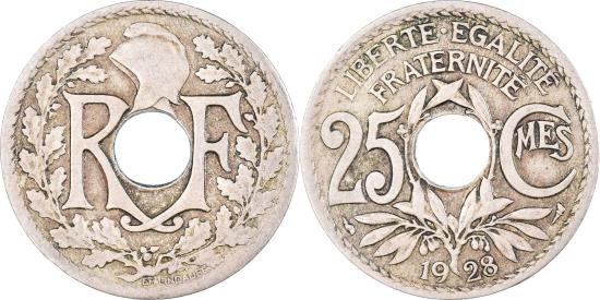 | | Coin, France, Lindauer, 25 Centimes, 1928, , Copper-nickel, KM:867a | | | Lindauer, Monogram divided by center hole, liberty cap above, wreath surrounds, Without dash under MES in denomination, Varieties: Edges reeded on 1920, 1929, 1931, different hole. | | FEATURES |