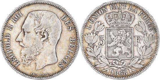 | | Coin, Belgium, Leopold II, 5 Francs, 5 Frank, 1868, , Silver, KM:24 | | | Smaller head, engraver's name near rim, below truncation, Crowned arms on ornate shield divide denomination, wreath surrounds, LEOPOLD II ROI DES BELGES | | FEATURES |