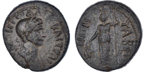 | | Coin, Caria, Trajan, Bronze Æ, 98-117, Tabai, , Bronze, RPC:2288 | | | Laureate bust to right, slight drapery on far shoulder, Demeter, polos on head, standing facing, holding corn-ears, bunch of grapes and sceptre., ΑΥ ΚΑΙ ΤΡΑΙΑΝΟϹ ΑΡΙϹ ΓΕΡ ΔΑ, ΤΑΒΗΝΩΝ | | FEATURES |