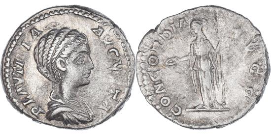 | | Coin, Plautilla, Denarius, 202-203, Rome, , Silver, RIC:363b | | | Draped bust right, Concordia standing left, holding patera and scepter, PLAVTILLA AVGVSTA, CONCORDIA AVGG | | FEATURES |