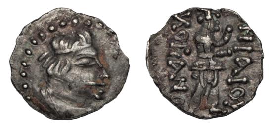 Circa AD 1-30. AR Obol (0.42 g). ‘Heraus’ type. Obv: Diademed and draped bust of moustached tyrant heraios to right / King Heraios standing to right, wearing nomadic dress, holding sword in his left and raising his right hand slightly, with Greek legend for "Heraios the Kushan".