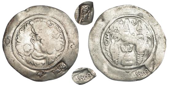 HUNNIC TRIBES: Hephthalites. Phromo Kesaro, Circa 7th-8th Century AR Drachm (3.42 g), imitating a drachm of Hormizd IV (579-590) from Balkh. mint in Bactria, Circa after 589. Dated Year 11. Draped bust of Hormizd IV to right, wearing elaborate mural crown with frontal crescent and korymbos set on crescent; behind head, AFZUT ('may increase' in Pahlawi); before head, WHLMZD ('Hormizd' in Pahlawi); in outer margin, countermark of a helmeted head of a Huna, wearing an earring. Rev. Fire altar flanked by two attendants; in upper left field, six-pointed star; in upper right field, crescent; to left, date in Pahlawi (RY 11 = AD 589); to right, BHL (Balkh, name of the mint in Pahlawi); in outer marigin, countermark of oρoρο in Bactrian. Vondrovec type O.IV. very fine host EF C/M. *The king who calls himself Phromo Kesaro ('Caesar of Rome') has been identified with Fulin Jisuo (Sinicization of the same title), who was approved by the Chinese emperor Xuanzong in 738 as the succesor to his father, the Khorasan Tegin Shah, in Kabul. He issued a number of Arab-Sasanian-style silver and copper coins bearing this title. The Sasanian occupation of Bactria lasted only a few years, but their Balkh drachms from the regnal years 9-11 became the prototypes for the local numismatic iconography and were eagerly imitated by the Hephtalite authorities for several decades. |